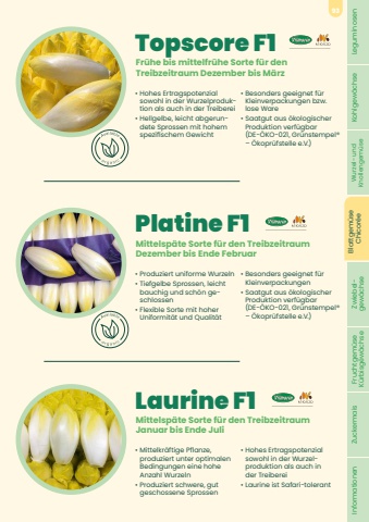 Topscore F1%u2022 Hohes Ertragspotenzial sowohl in der Wurzelproduktion als auch in der Treiberei%u2022 Hellgelbe, leicht abgerundete Sprossen mit hohem spezifischem Gewicht%u2022 Besonders geeignet f%u00fcr Kleinverpackungen bzw. lose Ware%u2022 Saatgut aus %u00f6kologischer Produktion verf%u00fcgbar (DE-%u00d6KO-021, Gr%u00fcnstempel%u00ae %u2013 %u00d6kopr%u00fcfstelle e.V.)Fr%u00fche bis mittelfr%u00fche Sorte f%u00fcr denTreibzeitraum Dezember bis M%u00e4rzLaurine F1%u2022 Mittelkr%u00e4ftige Pflanze, produziert unter optimalen Bedingungen eine hohe Anzahl Wurzeln%u2022 Produziert schwere, gut geschossene Sprossen%u2022 Hohes Ertragspotenzial sowohl in der Wurzelproduktion als auch in der Treiberei%u2022 Laurine ist Safari-tolerantMittelsp%u00e4te Sorte f%u00fcr den Treibzeitraum Januar bis Ende JuliPlatine F1%u2022 Produziert uniforme Wurzeln%u2022 Tiefgelbe Sprossen, leicht bauchig und sch%u00f6n geschlossen%u2022 Flexible Sorte mit hoher Uniformit%u00e4t und Qualit%u00e4t%u2022 Besonders geeignet f%u00fcr Kleinverpackungen%u2022 Saatgut aus %u00f6kologischer Produktion verf%u00fcgbar (DE-%u00d6KO-021, Gr%u00fcnstempel%u00ae %u2013 %u00d6kopr%u00fcfstelle e.V.)Mittelsp%u00e4te Sorte f%u00fcr den Treibzeitraum Dezember bis Ende FebruarLeguminosen Kohlgew%u00e4chse Wurzel- und Knollengem%u00fcse Blattgem%u00fcse Chicor%u00e9e Zwiebel- gew%u00e4chse Fruchtgem%u00fcse K%u00fcrbisgew%u00e4chse Zuckermais Informationen93