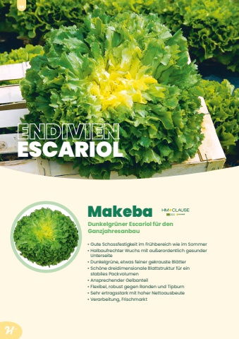 ENDIVIENESCARIOLMakeba%u2022 Gute Schossfestigkeit im Fr%u00fchbereich wie im Sommer%u2022 Halbaufrechter Wuchs mit au%u00dferordentlich gesunder Unterseite%u2022 Dunkelgr%u00fcne, etwas feiner gekrauste Bl%u00e4tter%u2022 Sch%u00f6ne dreidimensionale Blattstruktur f%u00fcr ein stabiles Packvolumen%u2022 Ansprechender Gelbanteil%u2022 Flexibel, robust gegen Randen und Tipburn%u2022 Sehr ertragsstark mit hoher Nettoausbeute%u2022 Verarbeitung, FrischmarktDunkelgr%u00fcner Escariol f%u00fcr den Ganzjahresanbau98