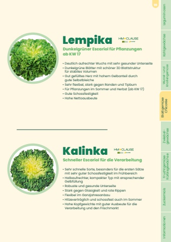 Lempika%u2022 Deutlich aufrechter Wuchs mit sehr gesunder Unterseite%u2022 Dunkelgr%u00fcne Bl%u00e4tter mit sch%u00f6ner 3D Blattstruktur f%u00fcr stabiles Volumen%u2022 Gut gef%u00fclltes Herz mit hohem Gelbanteil durch gute Selbstbleiche%u2022 Sehr flexibel, stark gegen Randen und Tipburn%u2022 F%u00fcr Pflanzungen im Sommer und Herbst (ab KW 17)%u2022 Gute Schossfestigkeit%u2022 Hohe NettoausbeuteDunkelgr%u00fcner Escariol f%u00fcr Pflanzungen ab KW 17Kalinka%u2022 Sehr schnelle Sorte, besonders f%u00fcr die ersten S%u00e4tze mit sehr guter Schossfestigkeit im Fr%u00fchbereich%u2022 Halbaufrechter, kompakter Typ mit ansprechender Gelbf%u00fcllung%u2022 Robuste und gesunde Unterseite%u2022 Stark gegen Glasigkeit und rote Rippen%u2022 Flexibel im Ganzjahresanbau%u2022 Hitzevertr%u00e4glich und schossfest auch im Sommer%u2022 Hohe Kopfgewichte mit guter Ausbeute f%u00fcr die Verarbeitung und den FrischmarktSchneller Escariol f%u00fcr die VerarbeitungLeguminosen Kohlgew%u00e4chse Wurzel- und Knollengem%u00fcse Blattgem%u00fcse Chicor%u00e9e Zwiebel- gew%u00e4chse Fruchtgem%u00fcse K%u00fcrbisgew%u00e4chse Zuckermais Informationen99