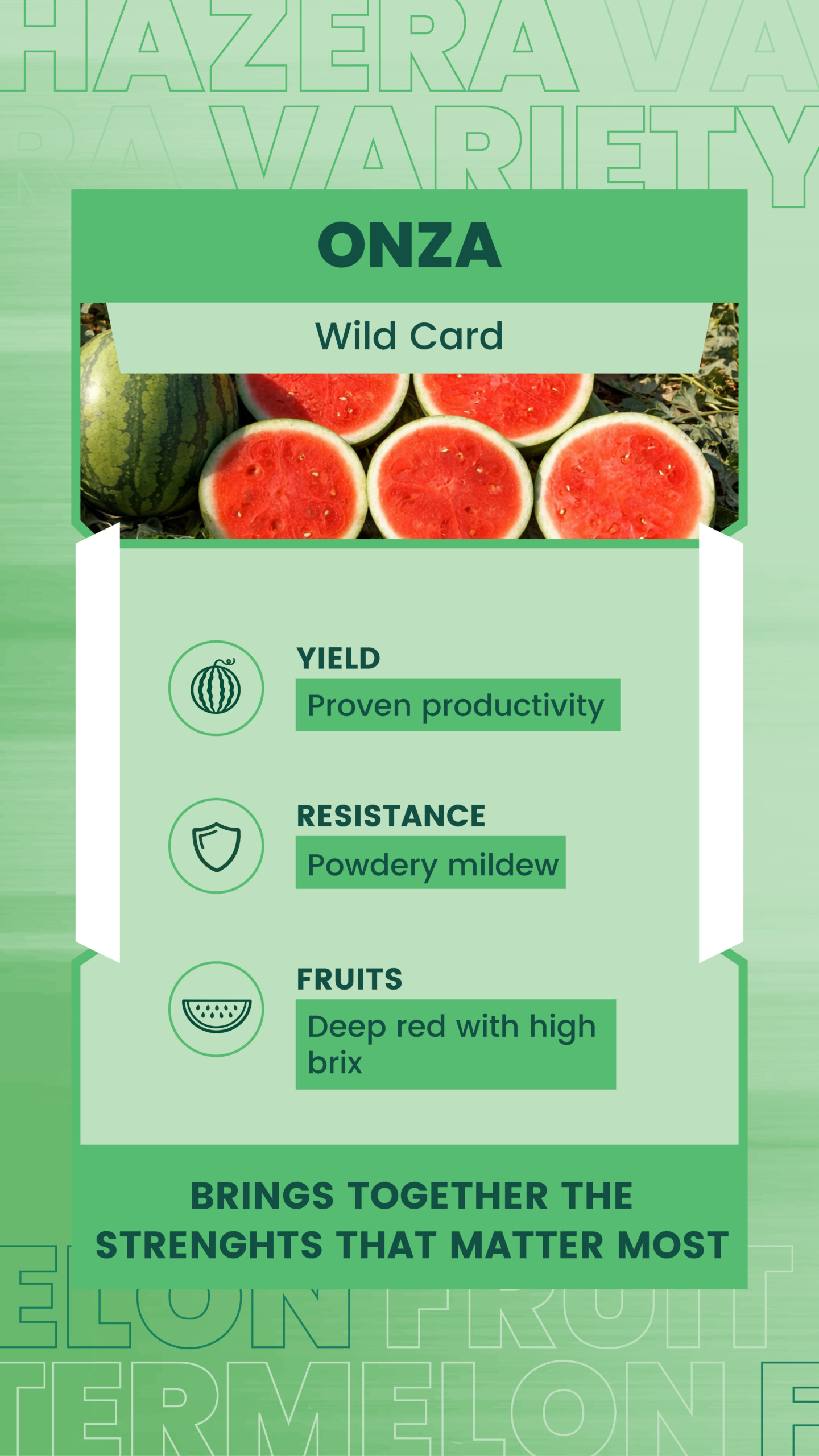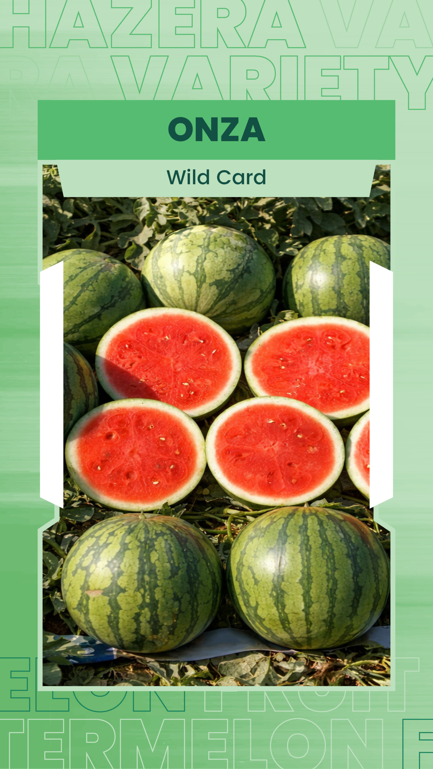 As a true Wild Card, ONZA brings an unexpected combination of compact size, strong performance, and outstanding fruit quality. This mini seedless watermelon proves that big impact doesn’t have to come from big fruit.